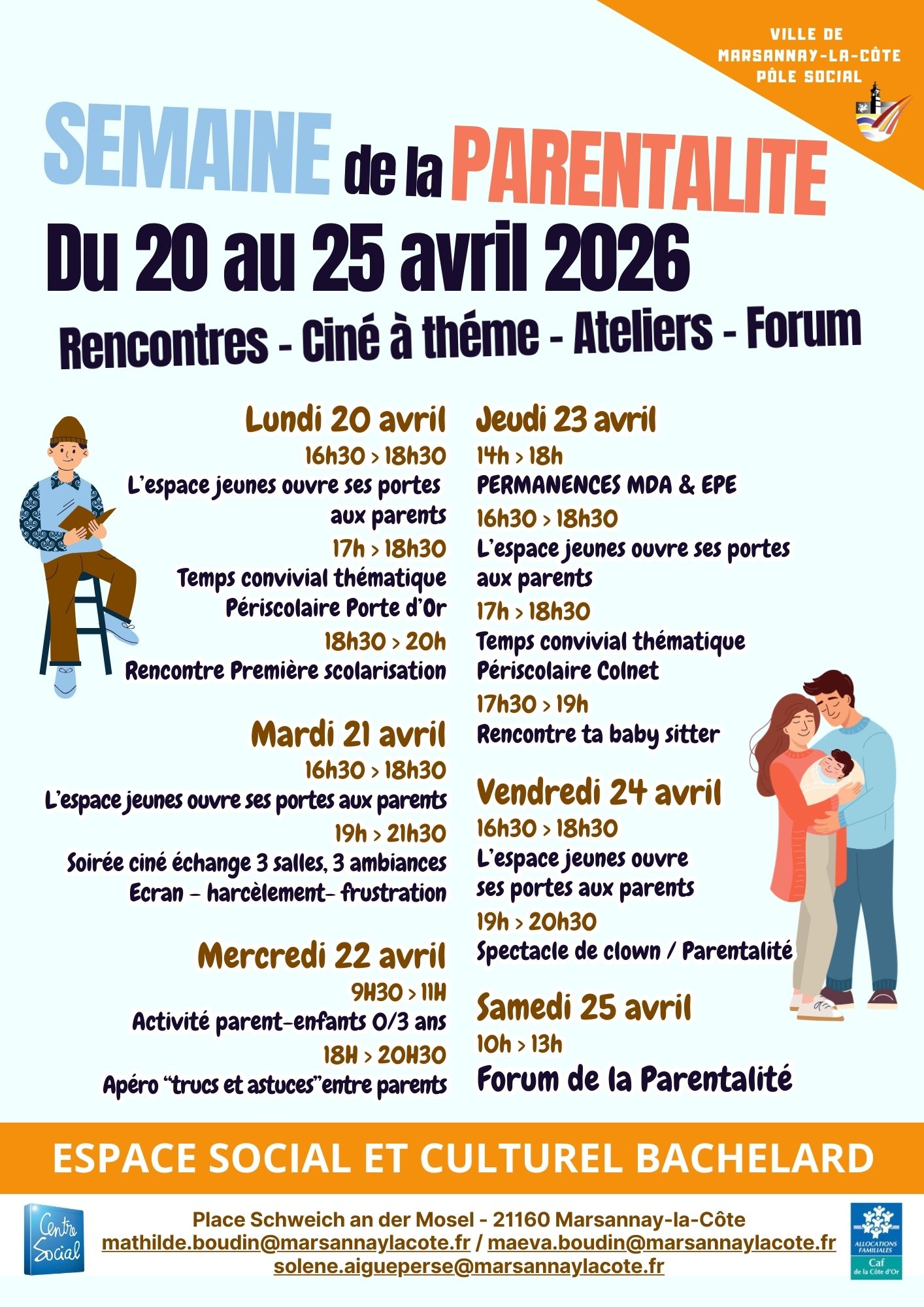 CIO, MDA, P’tit bleu p’tit jaune, PMI, CAF, MILO, EPE, CIDFF,… ils seront là pour présenter leurs missions et vous donner leurs coordonnées en cas de besoin !